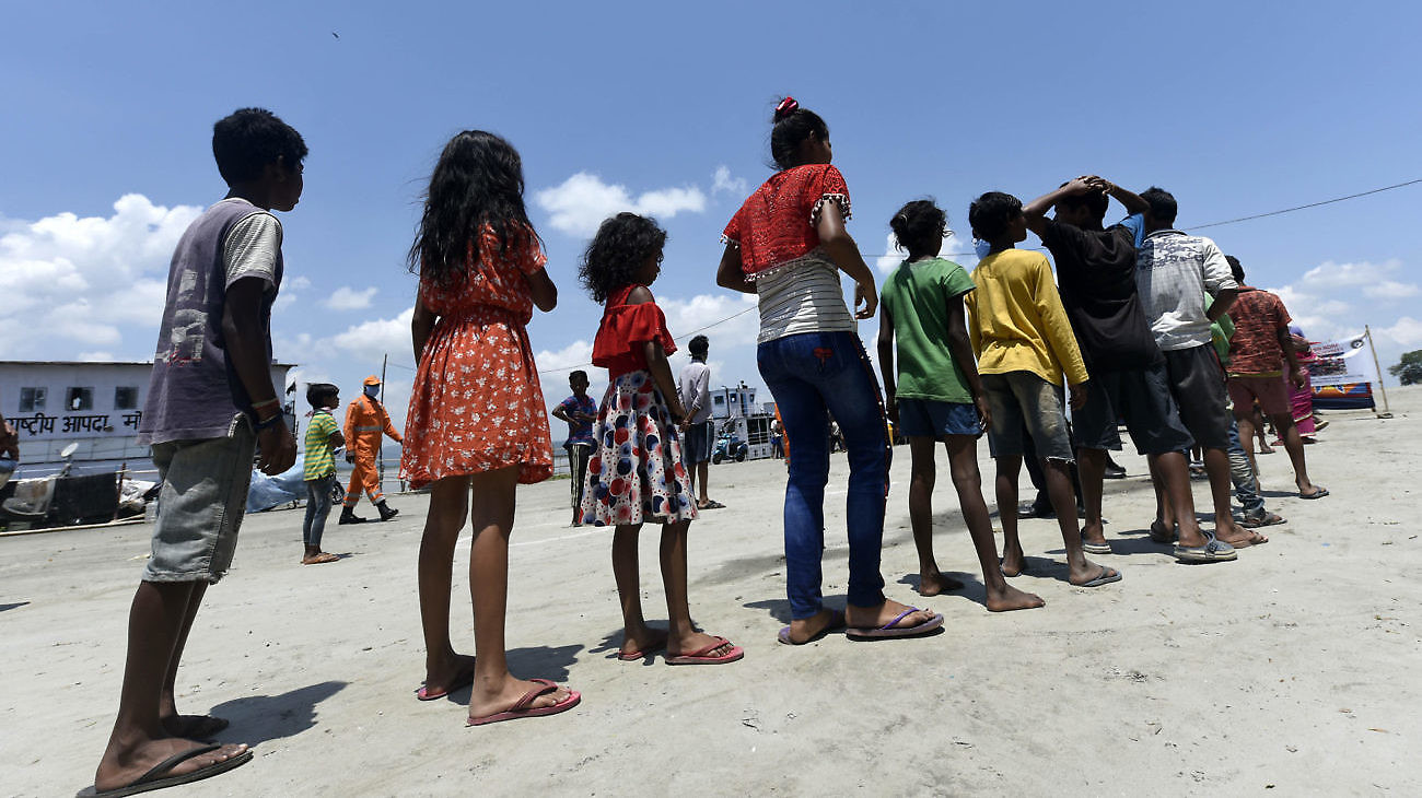 People wait in line to have food from National Disaster Response Force (NDRF) personnel, during nationwide lockdown in the wake of the coronavirus pandemic, in Guwahati, India on April 30. (David Talukdar/NurPhoto via AP)