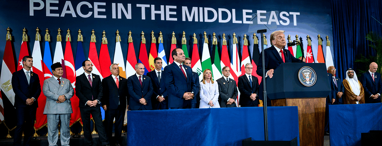 President Trump delivers remarks in Sharm El Sheikh, Egypt, during a summit on ending the war between Israel and Hamas in Gaza and advancing peace in the Middle East on October 13, 2025. The White House/Flickr.